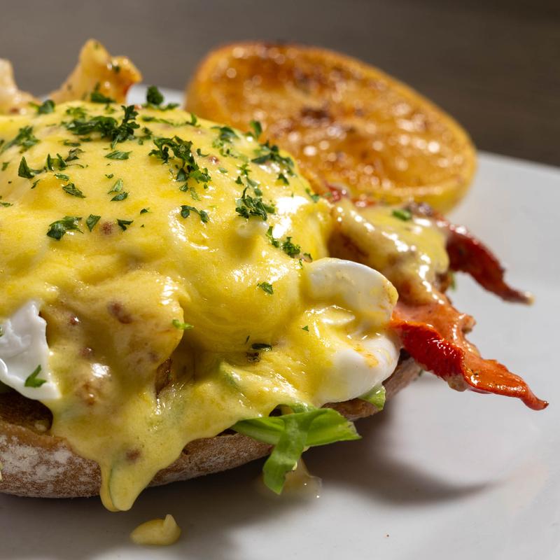 Smoked salmon, avocado, English muffins, poached eggs, hollandaise, home fries
